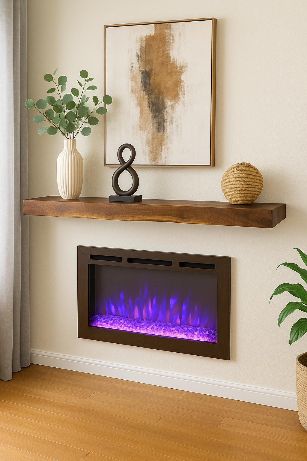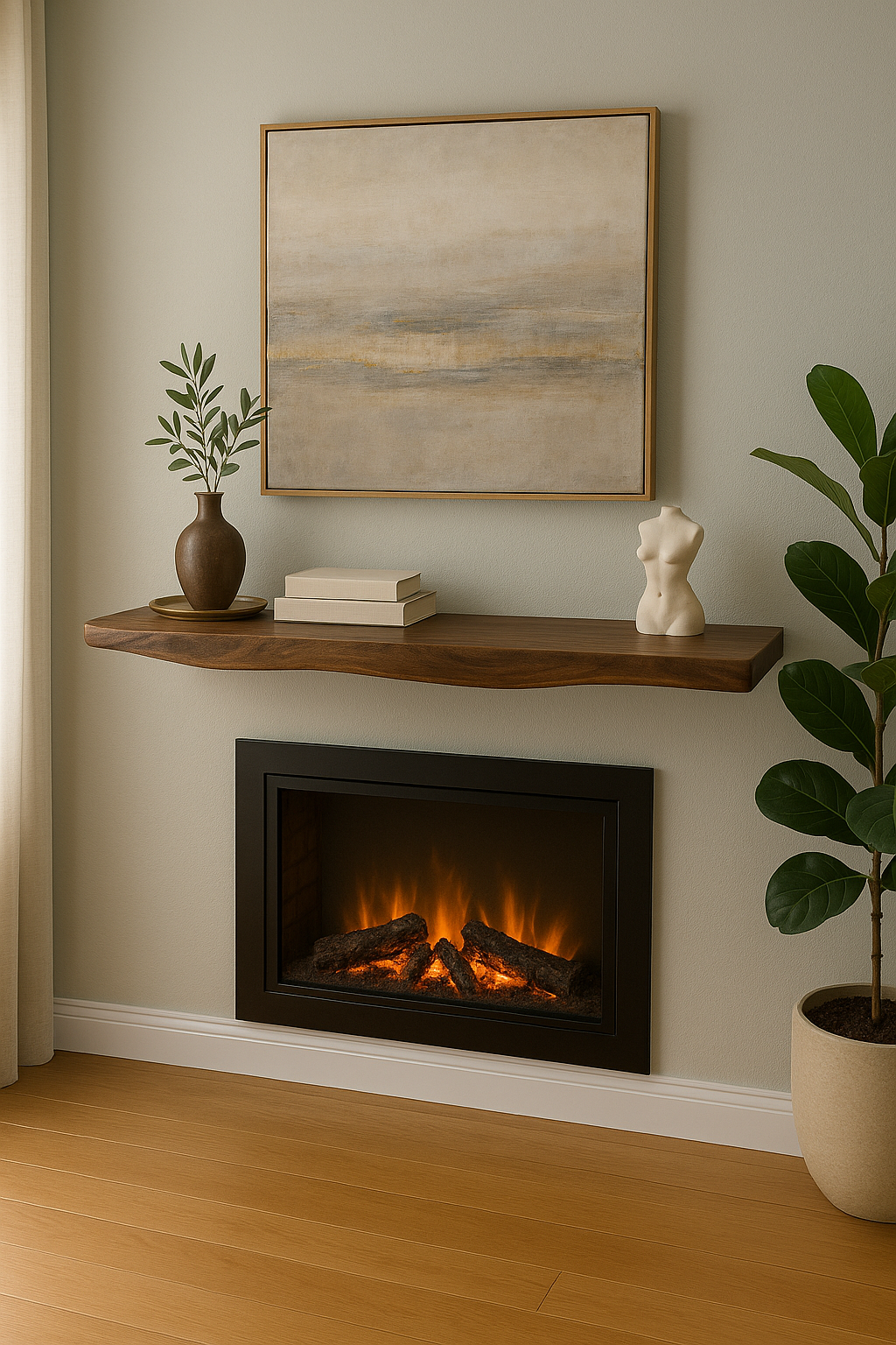 Live Edge Walnut Fireplace Mantel – Custom Solid Wood Floating Shelf